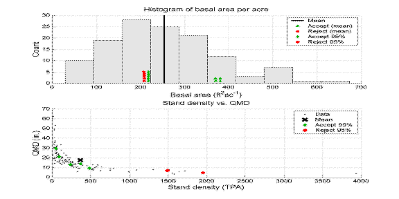 In the second analysis, the bottom plot in Figure 2, TPA and QMD are used to describe forest stands. TPA and QMD were used for this example because their product is proportional to BA and collectively QMD and TPA provide at least as much information as BA, as well as providing important information on habitat conditions. A single assessment procedure was applied for this 2-dimensional data set using a 95% acceptance region defined by a straightforward extension of the 1-dimensional procedure used for the BA analysis. Five of the seven test plots were accepted in this scenario, one from case A and four from case B, and two were rejected, one from each case. The two rejected plots have very high stand densities, in excess of 1000 TPA, and correspondingly small trees, on average, and they are clearly far from the main data cluster. The five plots that were accepted appear well within the main data cluster, as expected. Note that the 2-dimensional distribution of the TPA and QMD data is not symmetric. The distribution is curved and skewed towards larger values for both TPA and QMD. Given this distribution shape, the mean value for these data appears outside the envelope of the data, and therefore is not representative of the main data cluster.