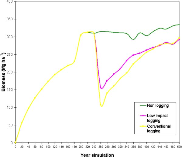 Logging damages are very high, particularly if we consider that only in the low impact option a volume similar to the original one is harvested after 60 years. The major differences are observed for conventional logging where even after 100 years this value is not similar to the low impact logging. Regarding stand biomass, the results are similar to those found by Uhl and Saldarriaga (1986), at San Carlos de Río Negro (Venezuela), concerning a linear increment of biomass at the beginning of forest recovery, increasing from 15 (at two years) to 150 Mg ha-1 at 60 years. This represents a 59% of the mature forest biomass. They estimate that an abandoned field needs from 140 to 200 years to reach a biomass similar to the mature undisturbed forest. This period could even be longer depending upon the degree of disturbance; in severe interventions more than 1000 years may be required to reach the values of the natural forest. On the other hand, we found that planning of the exploitation although may be more costly it allows a faster forest recovery.