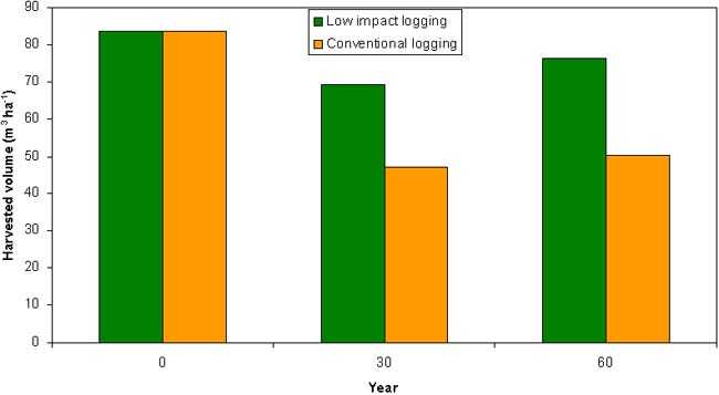Timber supply is expected to be lower for the next cutting cycle (30 years), with conventional logging yielding only 56% of the volume harvested in the first operation (Figure 3). For a 60 years felling cycle this logging method does not allow to reach yet the initial values.