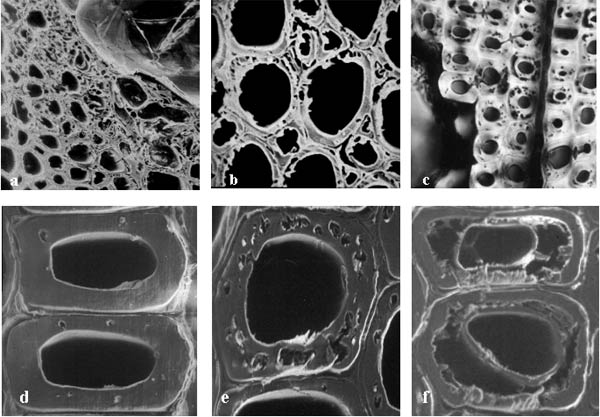 Las observaciones de las muestras en el microscopio electrónico de barrido confirmaron las observaciones hechas con el microscopio de luz; en las etapas iniciales del ataque, las pequeñas cavidades se circunscriben a la capa S2 de la pared secundaria (Fig. 1d), pero en etapas más avanzadas estas cavidades pueden presentarse también en áreas próximas a las capas S1 o S3, que no son atacadas inicialmente (Fig. 1e y 1f). En las etapas avanzadas, inclusive la lamina media es degradada por acción del hongo.