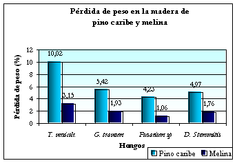 Figura 2. Pérdida de peso de las maderas de Pino caribe y Melina, ocasionada por los hogos estándar T. versicolor y G. trabeum y por los hongos de pudrición blanda Doratomyces stemonitis; Fusarium sp, identificados de suelos no estériles del bosque nublado.
