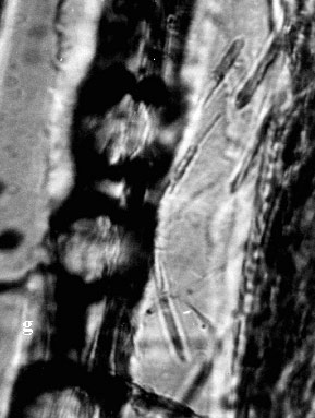 En las observaciones de los cortes longitudinales , tanto en el sentido radial como tangencial, se aprecian líneas traslucidas al microscopio de luz polarizada con una inclinación parecida a las que siguen las microfibrillas de que esta compuesta la pared secundaria, señal que la celulosa de la pared secundaria había sido degradada, observable por la perdida de birrefringencia a la luz polarizada (Nilsson y Daniel, 1998), con mayores aumentos (100 x) en el corte longitudinal fue posible observar la formación de cavidades con puntas en forma de ángulos, con aspecto de diamante, unidos por micro hifas que siguen la orientación de las micrifibrillas de la pared secundaria S2 (Fig, 1g). Esta forma de degradación es típica de los hongos de pudrición blanda (Eaton y Hale, 1993), donde los extremos de estas micro hifas, denominadas proboscis, siguen la dirección de las microfibrillas y luego de un corto recorrido el espacio degradado se amplia tomando aspecto de diamante que vuelve a terminar con la elongación de una nueva fina hifa.