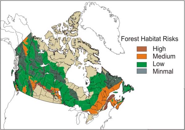 Nearly 600 000 ha or 60% of Canada is dominated by forested areas. This vast life zone provides seasonal and year-round habitats for two thirds of the nation's estimated 300 000 species, and consists of 12 major ecozones. Within these forest-dominated ecozones, there are 152 distinctive ecoregions that provide broadly different habitat types from temperate to sub-polar regimes, lowland plains to mountainous areas, and from virtually continuous forests through to lake, wetland, grassland and alpine complexes. Based on a unique and recent national wildlife habitat assessment, 25 of these ecoregions are already at moderate to high risk for habitat/ecosystem biodiversity conservation. The risks in these forested habitats have domestic, as well as continental significance, depending on the type and rarity of species and habitats they host. These more threatened habitats are located mainly along the southern and more commercially used areas but stressors such as climate change and wood harvesting are steadily becoming more prevalent in northern forests. Reporting on the status of forest habitats is a crucial step in forest conservation. It serves as a rational basis for resource planning and minimizing current and future risks in the vital forested landscapes of Canada and elsewhere.