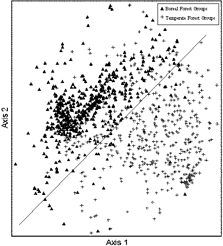 Figure 2: NMS results showing the distribution of Forest Groups typically more boreal in nature versus those more temperate. The line shows the general groupings of natural, mesic-xeric plots into these categories.