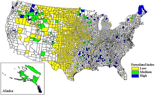 The United States is committed to using the Montreal Process for assessing progress towards sustainable forest management. One indicator requires the development of a measure of community viability and adaptability to changing economic conditions. Given the lack of community level data bases, data for the 3,110 counties (and some city/county and borough combinations) in the United States was used to develop a measure of community viability and adaptability that considered civic infrastructure, economic diversity (in terms of employment), and lifestyle diversity (Haynes [in press]). In addition, each county could be assigned a rating for forest dependency based on the proportion of forestland in each county). There are 837 counties assigned a low rating representing 36 percent of the area of the United States but just less than 3 percent of the U.S. population. The rest of the population is roughly evenly divided among the 2,064 counties assigned medium ratings and the 209 counties assigned high ratings.