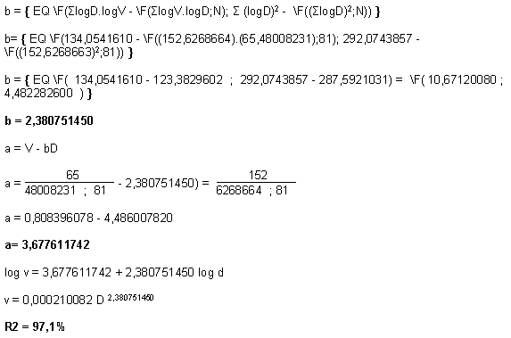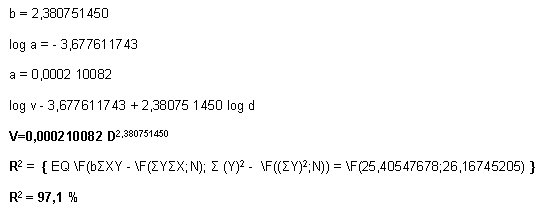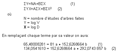 Le modèle mathématique de l'équation choisie étant: V = aDb cette équation est dite logarithmique du premier degré. D'où log V = log a + b log D. Les totaux de ces colonnes sont également donnés et en appliquant les formules on trouve directement les coefficients a et b.