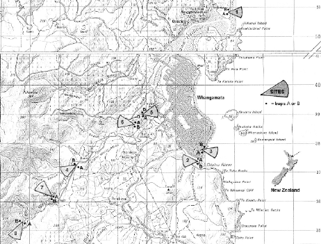 Malaise traps (Townes 1972), with 70% isopropyl alcohol in the collecting jars, were set out on December 5th 1997 at each of eight collecting sites in the Whangamata area (Figure 1). Traps were oriented with the collecting jars towards the north. The sampling protocol of trapping for just the four weeks of December is recommended by Hutcheson and Kimberley (1999) after an earlier intensive season long assessment of malaise trapping (Hutcheson, 1990) showed that collections during this period gave the best discrimination among habitats. Hutcheson emphasises Coleoptera on the basis that it is the largest of the insect orders and that it is well represented across all trophic levels.
