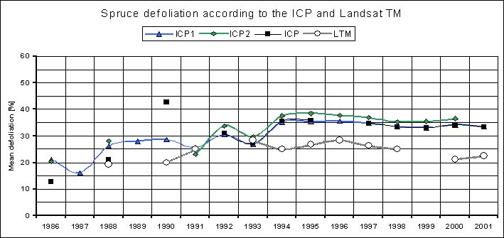 From the viewpoint of the long-term development the defoliation, as a main sign used, has an increasing trend. This is typical mostly in the case of old coniferous trees even though the dynamics of this trend has been significantly declined in beginning of the 90ties. Defoliation development of broadleaved has been slightly different. There was decline in 1998 but in following years the consecutive worsening has been recorded.
