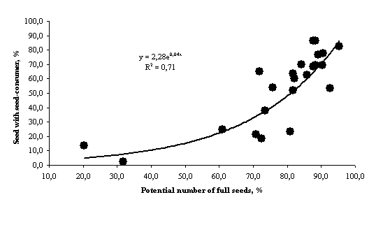 The study has shown that size of the population of the seed-consumer depends on amount of full seeds in stands (Figure 1). Ratio between seeds with larvae and full seeds is 42.5-73.3% on different plots. Amount of damaged seeds correlates with full seeds tightly (r=0,99**). Amount of seed-consumers correlates with amount of seeds with developed embryo for certain (r=0,71**).