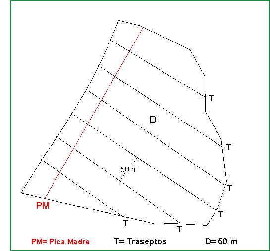 A nivel de campo el Inventario Forestal Precosecha, inicia con la definición de la pica madre (PM), para lo cual hay que tener un conocimiento preliminar del área boscosa a inventariar. A partir de la PM surgen los transeptos, los cuales se deben abrir perpendicularmente a la PM. Entre menor sea la distancia entre los transeptos, mas precisa será la información a recopilar, se recomienda una distancia entre transeptos de 50 metros. La PM y los transeptos en conjunto forman el esqueleto para levantar la información de campo (Fig 1). Sobre el transepto se dejan balisas cada 25 metros, marcando el borde superior de las balisas y se marca un punto fijo cada 100 metros y la distancia acumulada, a fin de facilitar la toma de datos y la revisión posterior del plan de manejo.