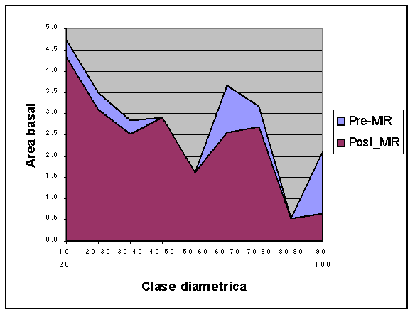 De la figura 5, se desprende que estos bosques antes y después de la cosecha, presentan una curva normal para un bosque sin intervenir, la cual es representada en forma de ´J¨ invertida típica de los bosques tropicales húmedos, donde la diferencia entre el Pre y Post MIR es 46 arb/ha, lo cual nos asegura que aun después de MIR estos bosques siguen manteniendo una estructura disetanea, con representación en todas las categorías diamétricas, donde lo que se cosecha es una parte de la estructura. Lo anterior indica un equilibrio poblacional de la masa forestal, donde las reservas de árboles pequeños son en todo momento lo suficientemente abundantes como para sustituir a los arboles grandes que son cosechados.