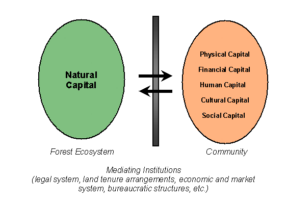 The "capital assets" framework facilitates understanding of the constituent components that are both necessary for and advanced by community-scale work. This framework also simultaneously clarifies a) the separation between communities and forest resources that impedes the advance of community forestry approaches and b) effective policy and programmatic approaches for building natural and community capital and transcending the institutional barriers that separate them. The assets framework builds on and extends work in which a) ecologically minded economists view natural capital as essential to human health and not, as conventional economists treat it, substitutable with financial capital or labor (Prugh 1995), b) poverty alleviation is achieved by building financial and physical capital (Sherraden 1991) and natural capital (Boyce and Shelly, forthcoming), and c) forest community well-being is reconceptualized (Kusel 1996, 2001). The assets approach involves a focus on system assets or stocks of natural wealth and community wealth that are integral to community and worker well-being.