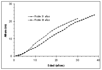 Al analizar el crecimiento en altura de las plantaciones, es posible detectar que hay una clara diferencia en calidad de sitio en favor de la plantación de 31 años, que se explica principalmente por las condiciones en que se desarrolla, asociada a suelos profundos y bien drenados con una escasa pendiente, a diferencia de la plantación de 38 años que se encuentra en un terreno con pendiente superior a 35%.