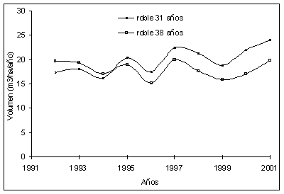 Figura 2: Evolución del crecimiento volumétrico anual de las plantaciones de roble.