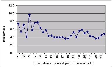 Los primeros 13 días que se ilustran en las Figuras 4 y 5, corresponden a las primeras dos áreas de prueba. En estos primeros días se observa gran variación en el número de trozas arrimadas por hora y se nota que el promedio diario es mayor que en el resto del periodo. Esto se debe a que en las primeras dos áreas la distancia máxima de arrime era menor a 480 m, y las trozas eran de un volumen unitario menor, por lo que con frecuencia se realizaron viajes con dos trozas, ya que se encontraban en áreas accesibles.