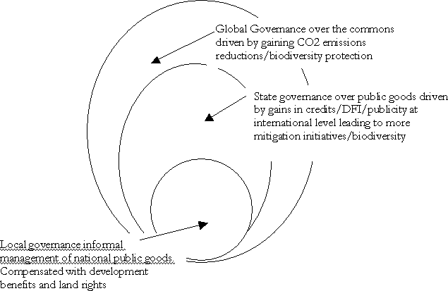The lens of enquiry considers the impacts and barriers to carbon sequestration projects within a framework of scales, including: global, national and local institutions. Governance of carbon sequestration schemes take place at these scales, including, global actors such as multilateral investment banks, private sector and NGOs, and local forest user communities who are characteristically considered one of the principal agents of change to threatened ecosystems. Carbon trading is to whom carbon credits accrue, and whether the state represents the rights of people from whos forest, tress and land credits are being gained. Each of these levels has something to gain in terms of benefits, but they have different interests and bargaining leverage, which impacts the sustainability of projects. The local issues most relevant to bio-carbon are rules over property rights access to information, organisation and participation.