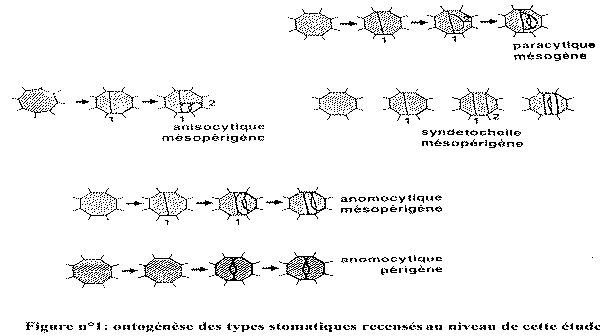 Le type paracytique mésopérigène a été recensé aussi par Saadoun (1991) chez les Chénopodiacées et les Polygonacées. D'après cet auteur, deux voies d'évolution des stomates semblent possibles à partir du type anomocytique mésopérigène (Figure n°02). La première permet l'évolution de ce dernier en anisocytique mésopérigène (T3), qui aboutira par suite d'une évolutiopn au type anisocytique mésogène (T6). Ce dernier donnera par la suite les types paracytiques et diacytique mésogènes (T4 et T5) d'une part et le type tétracytique (T7) d'autre part. Cette voie correspond à celle définie par Saint Martin (1982). La deuxième voie consiste en une évolution du type anomocytique mésopérigène (T2) en type paracytique mésopérigène (T3). Ce dernier pourra évoluer à son tour en type paracytique mésogène (T4).