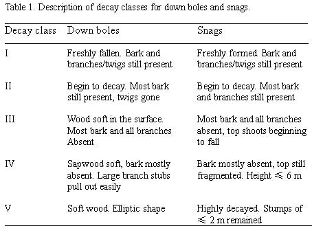 1) The density of CWD ranged from 0.231 to 0.737 g cm-3 and decreased with increasing decay classes.