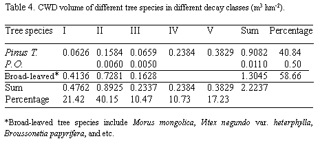 CWD volumes of different tree species in different decay classes are shown in Table 4. According to decay classes, CWD volume was distributed in the order of decay class II > class I > class V > class IV > class III. According to tree species, CWD volume was distributed in the order of broad-leaved trees > Pinus tabulaeformis > Platycladus orientalis. Generally, within the same forest stand, CWD volume of coniferous trees is larger than that of broad-leaved trees. However, we found the opposite result in our study. This was mainly because of short forest age of the mixed plantation in Xishan area, and thus less CWD was produced naturally and CWD was mostly formed after thinning operations. CWD from broad-leaved tree species was mainly snags and down boles with large DBH and height, and thus large volume.