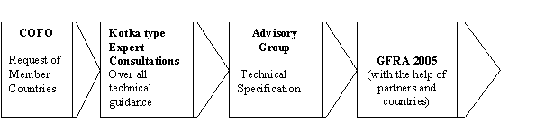 The fourth expert consultation at Kotka, Finland in July 2002, nick named Kotka IV, has provided a general framework to FRA programme (www.fao.org/forestry/fra-Kotka4), to follow the directions given by COFO 2001. The salient features of this framework are that FAO should (a) mainly focus on monitoring and assessment of forests, (b) develop a midterm GFRA in 2005 and usual ten yearly GFRA in 2010, (c) use the framework of "criteria" that are common among various regional processes of "C&I" for SFM for development of its future GFRA, and (d) establish an advisory group (AG to FRA) to provide detailed technical specification to FRA. The Advisory group to FRA, established on the basis of one of the recommendation of Kotka IV, has sketched the technical details for implementation of this framework. Figure 1 provides an overview of this process.