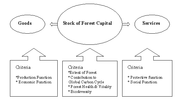 The GFRA uses spatial functional boundaries of alternative types of forest management (Holmgren 2002) and plans to utilize the technical conceptual framework of "capital and its goods and services" (Govil, 2002a) for reviewing (assessing) the sustainability of forest resources. The concept of "capital" is a neo-classical economic concept that defines "capital" as the stock of real resources with power (function) of producing "goods" (or utilities and service) in the future (Berkes and Folke, 1994; Daly, 1994; Van del Perk, Chiesra, and Groot, 2000). Figure 2 illustrates the relationship of these three elements with criteria for assessment purposes and in doing so subdivides the first and the last criterion into two sub groups.