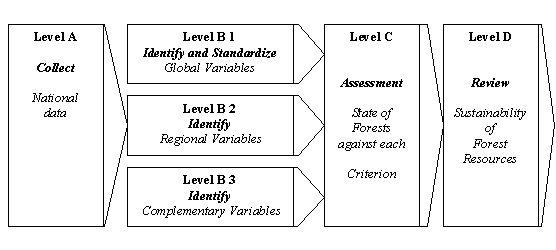 The third level (C) focuses on assessment of state of forest conditions against each of the six criterion through "global", "regional" and "complementary variables". This step involves ranking, valuation and then aggregation of variables measured along varied dimensions by using "GCM" to derive convergence among varied valuations done by different stakeholders.