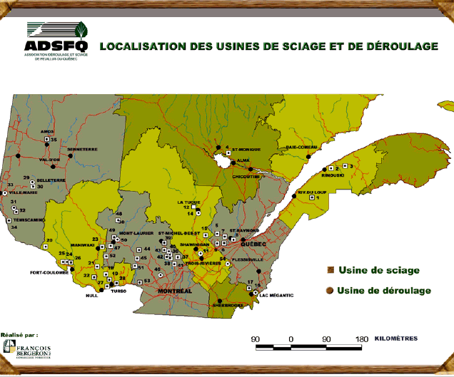 Les usines membres de l'Association déroulage et sciage des feuillus du Québec sont situées principalement dans les régions de l'Outaouais, des Laurentides, du Témiscamingue, de la Mauricie, de Québec, du Bas-Saint-Laurent et du Saguenay-Lac-Saint-Jean. La carte de la page suivante montre la localisation des usines des membres de l'ADSFQ.