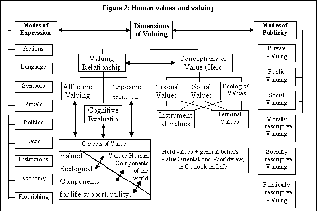 Figure 2 focuses on specifically human-centered values and valuing. In the center we distinguish two primary dimensions of valuing. Conceptions of value or held values, are part of a person's value orientations and philosophy of life - what one tells oneself is most important. Values and value orientations can be classified in various ways. We distinguish personal (ideals for oneself), social (ideals for a good society), and ecological (criteria for evaluating better and worse states of nature) value clusters. Each set has both instrumental and terminal values (means and ends).