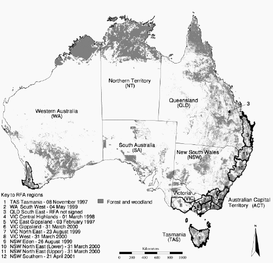 Figure 1 Australian forests and woodlands and regions with signed Regional Forest Agreements (source National Forest Inventory, August 2001)