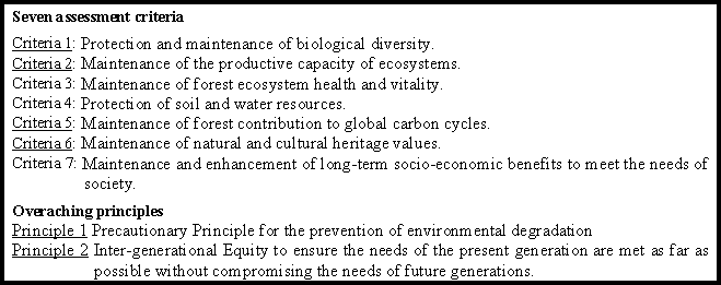 Independent scientific assessments of the State's forest management systems and processes were carried out to determine the extent to which ecologically sustainable forest management for the full range of forest values was achieved. State management systems and processes were benchmarked against the requirements of the international environmental management system model (AS/NZISO 14001, 1996). Seven forest management criteria for sustainable forest management from the Montreal Process (1995) and two over-arching principles were used (Table 2). Where deficiencies were identified, recommendations for improvement were made and incorporated into final Agreements. These included continuing development of forest management systems and the use of criteria and indicators for assessing progress towards achieving sustainable forest management. Sustainability criteria and indicators were developed for application at both national and regional scales. Environmental management systems that were capable of responding to varying temporal scales, lag effects and changes of forest ecosystems as a means of achieving ecologically sustainable forest management (Principle 8) were established on public lands (Operational Guideline 3).