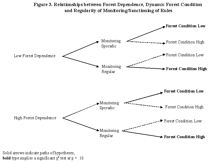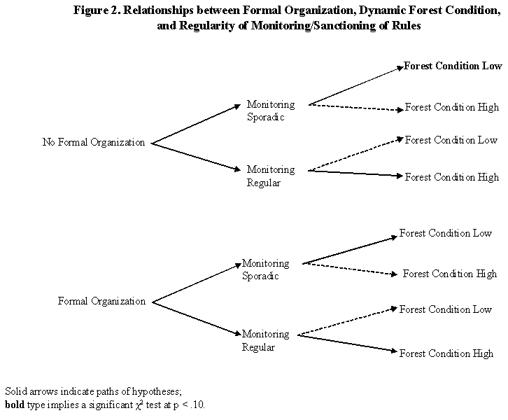 We argue that the same pattern holds in the relationships between enforcement and formal organization of user groups, and between enforcement and a group's dependence on forest resources: where rule enforcement is frequent, we expect better forests; where it is sporadic or non-existent, worse forests. Regardless of a group's level of formal organization or of a group's dependence on a forest's resources, the frequency of rule enforcement should be more important in determining forest conditions.