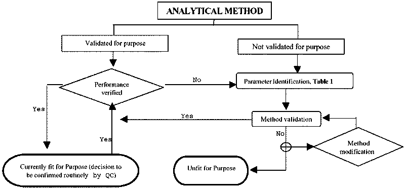 (a) The representative analytes selected should:4.4.3 Where appropriate data are already available, it may not be necessary for the analyst to perform all the tests. However, all required information must be included or referred to in the validation records. Table 1 provides an overview of parameters to be assessed for method validation according to the status of the method to be validated. Specific parameters and criteria to be assessed are listed in table 2. Parameters to be assessed should be restricted to those that are appropriate both to the method and to the purpose for which the particular method is to be applied. In many cases, performance characteristics with respect to several parameters may be obtained simultaneously using a single experiment. Test designs where different factors are changed at the same time (factorial experiment designs), may help to minimise the resources required. The performance of the analytical method should be checked, both during its development and during its subsequent use as indicated in section 4.5, according to the criteria given in Table 3.(i) possess sufficiently wide range of physico-chemical properties to include those of represented analytes;(b) As far as practicable, all analytes included in the initial validation process should be those which will have to be tested regularly and which can be determined simultaneously by the determination system used.(ii) be those which are likely to be detected regularly, or for which critical decisions shall be made based on the results.