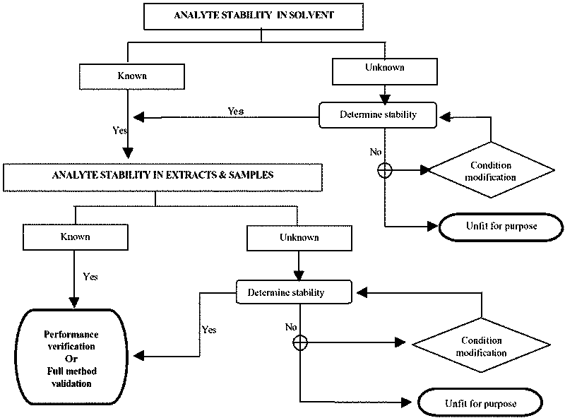 4.4.2 Whenever a laboratory undertakes method development and/or method modification, the effects of analytical variables should be established, e.g. by using ruggedness tests, prior to validation. Rigorous controls must be exercised in respect of all aspects of the method, which may influence the results, such as: sample size; partition volumes; variations in the performance of the clean-up systems used; the stability of reagents or of the derivatives prepared; the effects of light, temperature, solvent and storage on analytes in extracts; the effects of solvent, injector, separation column, mobile phase characteristics (composition and flow-rate), temperature, detection system, co-extractives etc. on the determination system. It is most important that the qualitative and quantitative relationships between the signal measured and the analyte sought is established unequivocally.