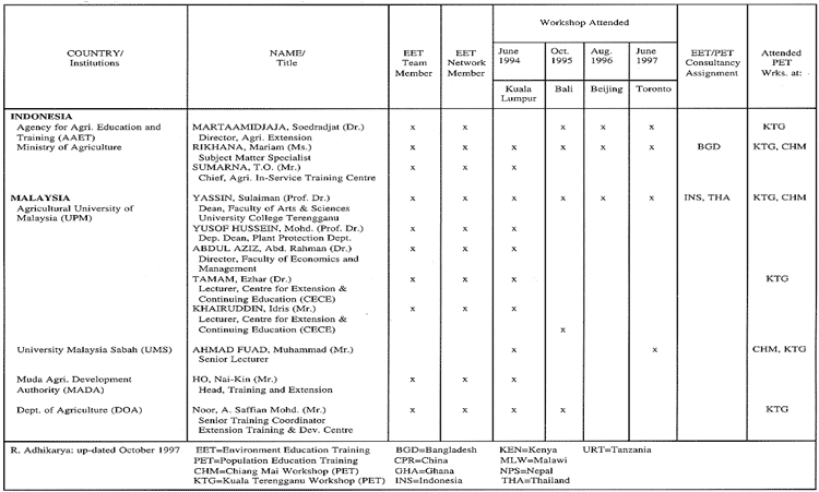 Furthermore, a panel of EET resource persons, highly qualified and experienced in relevant fields such as environment, agriculture extension, education, training and communication, has been established to provide "on-demand" advisory, consultative and trouble-shooting services. They have provided useful ideas and suggestions during EET regional and national workshops and made objective assessments and comments to participating training institutions for improving their EET activities. The list of EET participating institutions and EET key network members as of October 1997 is shown in Annex 2.