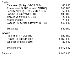 Estimated cost and return (in VN$) of rice-prawn culture in 1 ha coastal areas in South Viet Nam