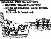 7. Sewage fertilization is repeated when the seedlings have taken roots and again during the flowering stage. The fields are irrigated regularly and the water level is maintained until the rice is mature. Pesticides are used only when necessary.