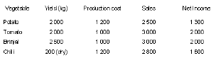 Note: About 25 different kinds of vegetables are grown in single/mixed or multiple cropping and an average production of 3 000 kg valued at Rs7 260 is obtained. With the cost of production being Rs5 400, a net profit of Rs1 860 is taken by farmers. In small farms, the farmer uses own labour which accounts for 60 percent of the total production costs; hence, he nets out an income of Rs1 860 + Rs3 240 = Rs5 100 or US$ 204.00 (as of 1992).