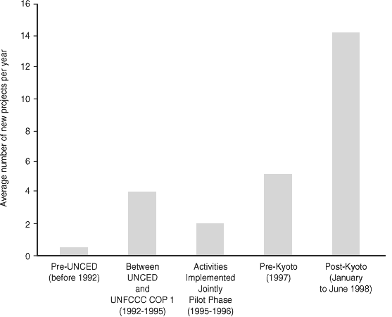 During the almost ten years since UNCED, forestry-based carbon offsets have evolved from a theoretical idea to a market mechanism for accomplishing global environmental objectives. To date, more than 40 forestry projects have been established with the main objective of fixing carbon or preventing its release to the atmosphere (Moura-Costa and Stuart, 1998) (Figure).
