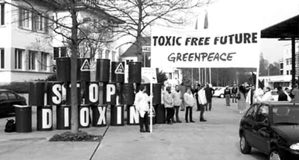La participation des ONG aux politiques écologiques mondiales est désormais la norme; des ONG comme Greenpeace peuvent sensibiliser le public aux problèmes et faire pression sur les gouvernements pour qu'ils prennent des mesures: ci-dessus, manifestants hostiles aux substances toxiques, à l'extérieur des négociations pour la Convention sur les polluants organiques persistants, à Bonn (Allemagne)