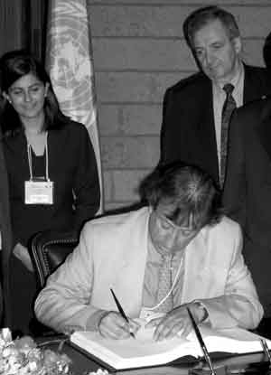 Juan Myers, (Colombie) président des négociations, signe le Protocole sur la prévention des risques biologiques - INSTITUT INTERNATIONAL DU DÉVELOPPEMENT DURABLE/A. HENRY Dans le cas de la CBD , les travaux de l'UICN et, par la suite du PNUE, ont été décisifs pour attirer l'attention sur la question de la conservation de la diversité biologique et fournir un soutien institutionnel. Au début des années 80, les préoccupations de la communauté internationale, face à l'ampleur de la perte de diversité biologique, se sont intensifiées sous l'effet d'un consensus croissant des milieux scientifiques sur ce problème. L'UICN a catalysé les efforts en vue d'élaborer un accord international pour conserver la diversité biologique, et demandé à son Assemblée générale de produire un avant-projet d'accord mondial sur ce sujet. En juin 1987, le Conseil d'administration du PNUE a pris la décision d'établir un Groupe spécial d'experts de la diversité biologique. Au fur et à mesure de l'accroissement des préoccupations et du consensus international sur ce sujet, le groupe a évolué pour devenir un Groupe spécial d'experts juridiques et techniques sur la diversité biologique et, en 1991, alors que la phase de l'établissement des faits touchait à sa fin, le groupe spécial a été transformé en CIN pour une convention sur la diversité biologique. Comme la convention devait être achevée à temps pour la CNUED, le CIN a conclu les négociations en cinq sessions de deux semaines (Sanchez et Juma, 1994). La négociation de la CBD a également démontré l'impact que peut avoir un individu sur le processus. Mustapha Tolba, alors Directeur exécutif du PNUE, a pris ses fonctions et remplacé le président désigné du CIN; en gros, il a soumis sa propre convention aux délégués pour approbation, juste avant la conférence diplomatique qui devait l'adopter. (Porter, Brown et Chasek, 2000). Après l'entrée en vigueur de la CBD en 1993, celle-ci est passée à la phase de renforcement du régime. Initialement, l'élaboration d'un protocole sur la biodiversité forestière avait des partisans, mais la question a été renvoyée à une date ultérieure, essentiellement à cause des pressions exercées par les pays exportateurs de produits forestiers qui voulaient empêcher que la CBD ne prenne des dispositions concernant les forêts. La CBD a élaboré des programmes thématiques sur la diversité biologique des eaux continentales, des forêts, des zones maritimes et côtières, des terres arides et des terres agricoles. La plus grande réalisation de la CBD à ce jour est la négociation du Protocole sur la prévention des risques biologiques (connu également sous le nom de Protocole de Cartagena), qui a été adopté en janvier 2000 à Montréal (Canada) après un quasi-échec à Cartagena de Indias (Colombie), en 1999. En ce qui concerne les espèces exotiques, la CBD a entamé un processus de collaboration avec des conventions ayant des mandats connexes dans d'autres secteurs, en particulier la Convention internationale pour la protection des végétaux (CIPV). Dans le cadre de l'harmonisation avec la CBD et les négociations intergouvernementales conduites par la Commission de la FAO sur les ressources génétiques pour l'alimentation et l'agriculture, l'Engagement international sur les ressources phytogénétiques est en cours de révision et devrait devenir un instrument juridiquement contraignant pour tout ce qui concerne la conservation, l'utilisation et le partage des avantages des ressources phytogénétiques pour l'alimentation et l'agriculture. |