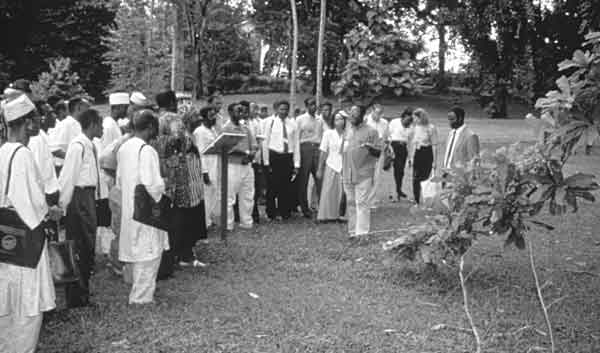 Des chercheurs, des représentants de gouvernement, des ONG et d'autres personnalités s'entretiennent dans le jardin botanique de Limbe (Cameroun), de questions relatives à l'exploitation d'Ancistrocladus korupensis (visible au premier plan), à la commercialisation des plantes médicinales et aux avantages que le Cameroun pourrait en retirer