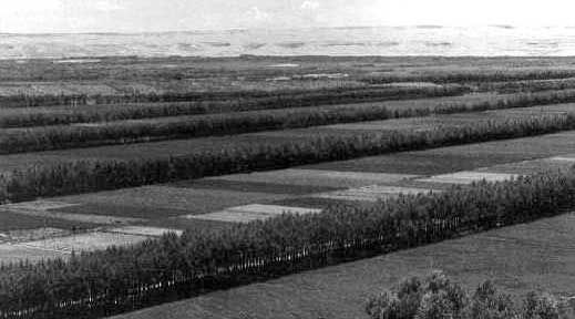 Des rideaux-abris plantés sur les montagnes de la Province de Qinghai permettent de mettre en culture une zone jadis déserte; on aperçoit au deuxième plan une zone de dunes encore non aménagée