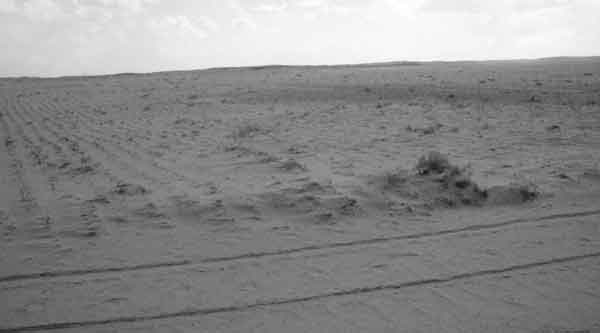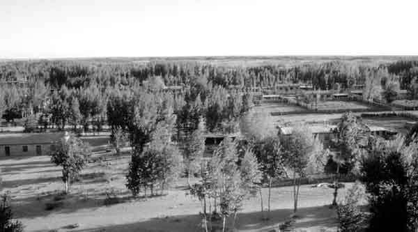 Les efforts de la Chine pour combattre la désertification ont précédé la CCD; dans le cadre du programme des "Trois Nords", des activités de reboisement ont été entreprises depuis les années 70 à gauche, des peupliers plantés dans une zone désertique de la Mongolie-Intérieure à droite, une zone reboisée de la Mongolie-Intérieure