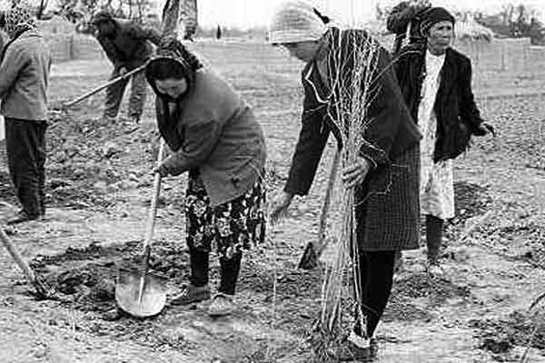 Des femmes plantent des arbres dans la province de Xinjiang. Des activités de sensibilisation menées à grande échelle ont permis la création de groupements féminins qui cherchent à vaincre la désertification par la plantation d'arbres