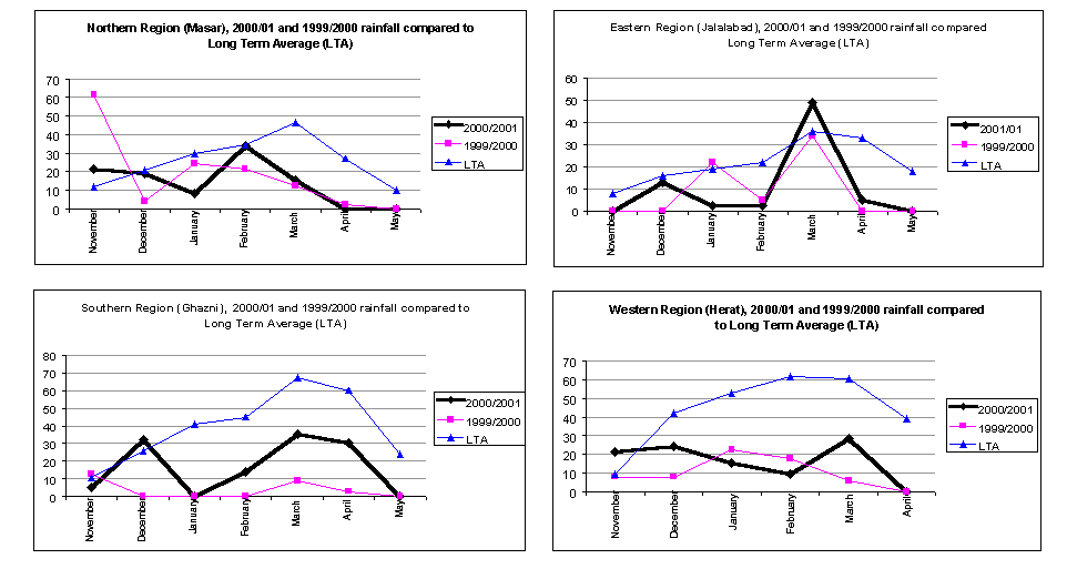 This year as reported by almost all recording stations, rainfall performed somewhat better compared to the very poor performance during the 1999/2000 cropping season but has everywhere been well below the long term average (LTA). Precipitation started well and continued at reasonable levels until the end of December but then suddenly declined dramatically and ceased thereafter in most places. This has resulted in a virtual failure of the rainfed wheat and a low yield of the irrigated wheat. Figure 1 shows the 2000/01 rainfall data compared with those of the previous season as well as with the long term averages from four representative stations, located in the eastern, southern, western and northern regions of Afghanistan.
