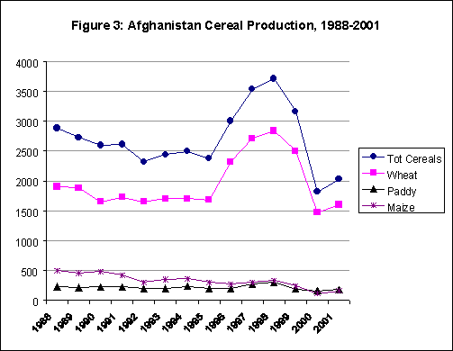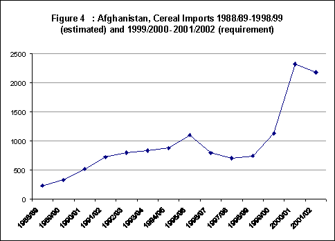 During its extensive field visits, the Mission observed that rainfed crops (wheat and barley) had almost totally failed, except in a few pockets in different regions. The rainfed wheat production in 2001 is estimated to be about 40 percent less than even last year's extremely low output. The 2001 irrigated cereal production was also, like that of 2000, severely affected by drought. However, given slightly better rainfall in some areas and transfer of land and irrigation water from poppy to wheat, the irrigated wheat production in 2001 is estimated about 14 percent more than in 2000, but still about 25 percent less than in 1999. The production of secondary crops (rice, maize, barley) is estimated to be about 24 percent more than last year's extremely low output, but remains some 42 percent less than in 1999. The Mission thus estimates the 2001 total cereal production at 2.03 million tonnes - about 12 percent larger compared to 2000 but smaller by 37 percent compared to 1999. As a result, the cereal import requirement in the 2001/02 marketing year (July/June) is estimated at 2.2 million tonnes, slightly less than last year's record high level of 2.3 million tonnes, but about double the volume of 1.1 million tonnes in 1999.