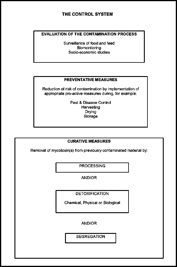 The Control System (Figure 6) illustrates a selection of preventative and curative interventions (measures) which may be utilised for the control of mycotoxins, once the nature of the contamination process has been properly evaluated.
