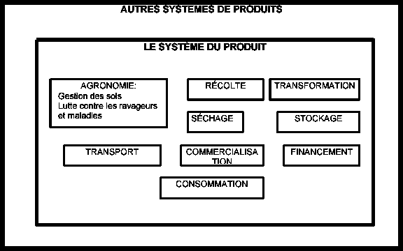 Tout système de produit se compose de nombreux processus techniques et socio-économiques sinfluençant mutuellement, qui comprennent par exemple la lutte contre les ravageurs et les maladies, la récolte, le séchage, la transformation, la commercialisation, les politiques de prix et de crédit, ainsi que des questions culturelles, pour nen citer que quelques uns. La figure 1 représente un système de marchandises généralisé et simplifié et les interactions entre certains processus qui en constituent les sous-systèmes.