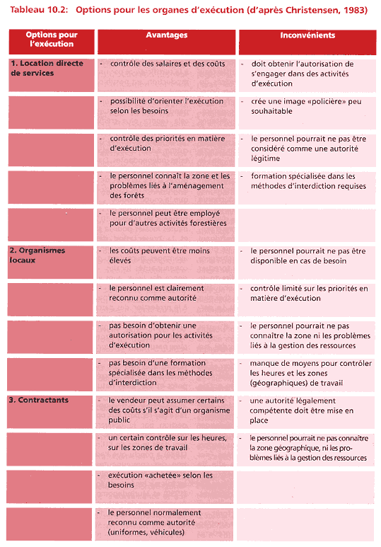 Christensen (1983) a examiné des options institutionnelles pour l’exécution et identifié trios solutions: 1) location directe des services du personnel d’exécution, 2) recours à des organismes locaux tels que la police, l’armée ou autres, et 3) passer contrat avec des organisations ou sociétés indépendantes. Les avantages et inconvénients de ces trois options sont présentés au tableau 10.2.