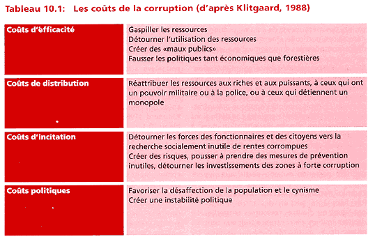 La corruption comporte pour la société des coûts difficiles à évaluer. Ils ont été classés par Klitgaard (1988) et sont résumés dans le tableau 10.1.